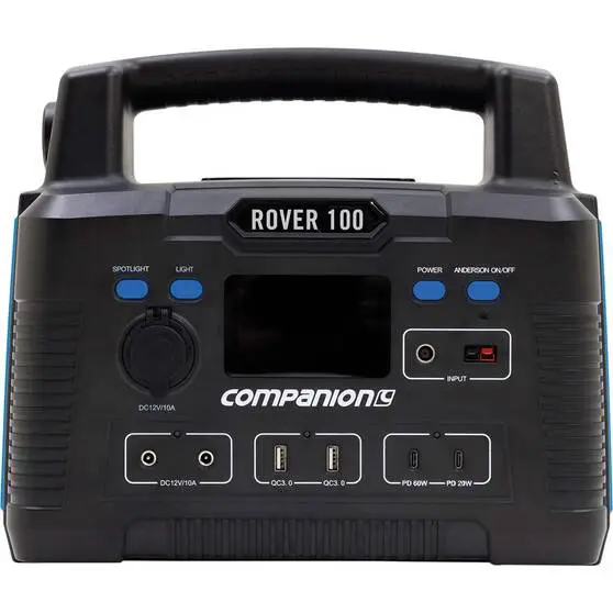 The Rover 100Ah Lithium Power Station by Companion is an excellent power solution for when you are in the great outdoors. Containing a massive 100Ah LiFePO4 lithium battery with a 2000 cycle life it has plenty of juice to keep you going and going! This handy unit can be charged 3 different ways with choices between AC, DC and solar so you will be able to keep powered up even when you are off grid. The Companion 100Ah Power Station has various outlets for anything you might need to keep charged. It has 2 x USB, 2 x USB C, 2 x anderson plug, 2 x cigarette sockets and 2 x DC jack outlets. Capable of charging all your devices and running any power product you might need on your outdoor adventures. Last but not least it has a built-in torch to help you operate in the dark! So if you are looking for a flexible and long lasting power solution, then give this little beauty a go!