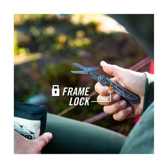 You won’t find rounded smooth plastic or thin dainty blades on this tool. Large tool tabs and indications get you to the right tool the first time with a thumb, not a fingernail. All your cutting needs in a thin frame; scissors for finer cuts and easy one-hand access to the 2-1/2″ frame lock blade that can rip through anything you put in front of it. Don’t get caught unprepared, support your daily carry with this robust tool in your pocket or on your key chain to get you out of any jam.