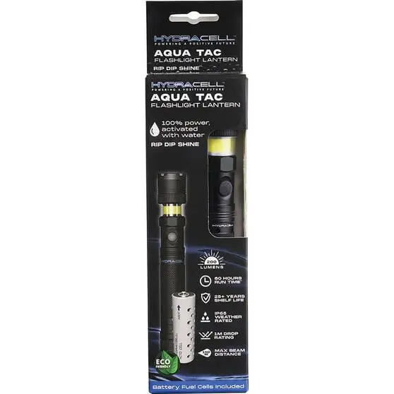 Introducing the Hydracell Aqua Tac Torch and Lantern Combo, tough, long lasting and environmentally friendly! Hydracell torches don’t run on your standard alkaline batteries, instead they are powered by a Hydracall water activated battery fuel cell. Simply dip the fuel cell in water for a few seconds to activate the battery then re-insert in the torch and you’re ready to go. The battery will last up to 75+ hours with periodic re-activation in water and once it has been completely depleted simply buy a replacement cell. The Hydracell battery fuel cells are biodegradable and recyclable, an excellent choice for a more sustainable lighting option. The Aqua Tac has a 200 lumen output and a beam distance of 150m. The perfect torch for any outdoor adventure!