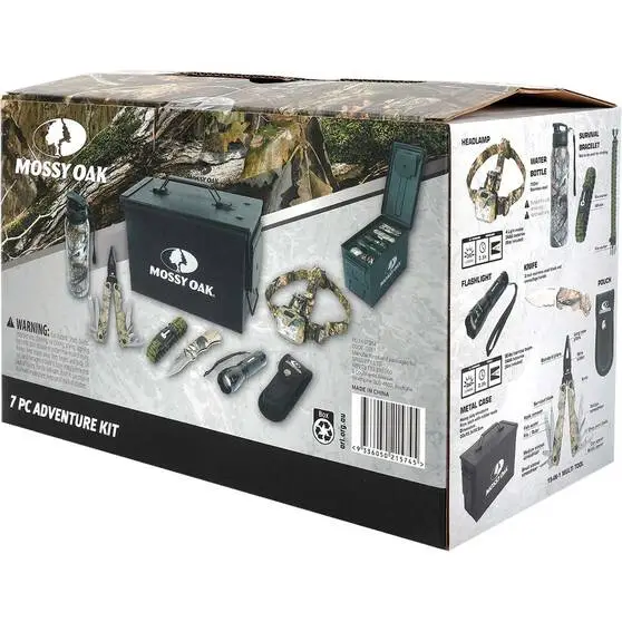 Been looking for a gift for that hard to buy for person? Well BCF has you covered with their Mossy Oak 7 Piece Adventure Kit! The kit comes with everything you need for the outdoor enthusiast to keep them prepared for any situation! The kit contains all the essentials, a folding knife, multi-tool with sheath, headlamp, torch, paracord bracelet, water bottle and a handy tin to store it all in.
